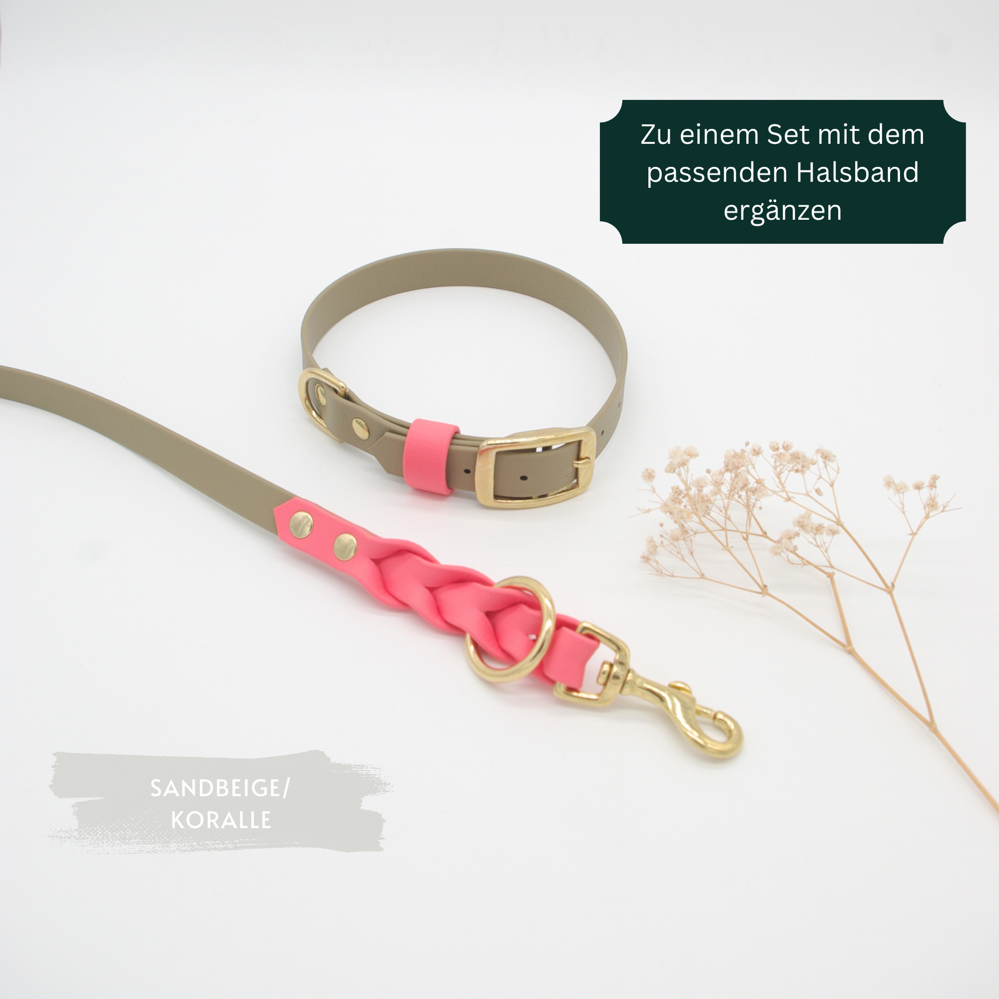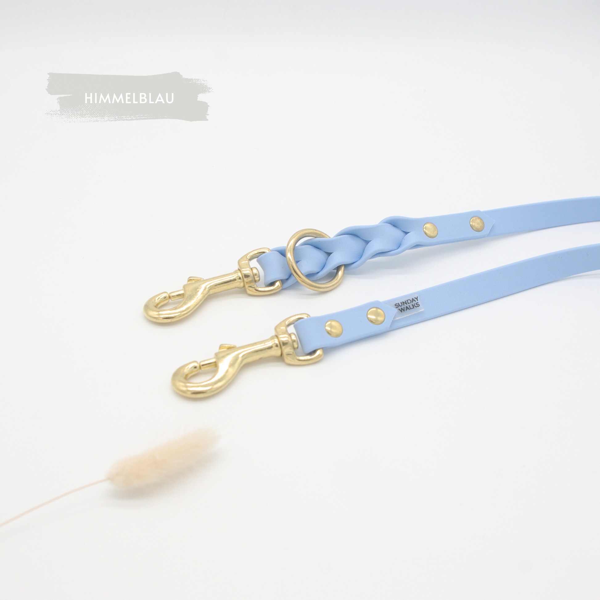Der Artikel umfasst eine Leine in der gewünschten Farbe und Länge mit Ösen/Schieber und Karabinern. Der Versand erfolgt ohne weitere Dekoartikel wie Halsband oder Geschirr.